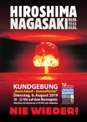 Zeit 6. August 2019 - 18:00 Ort Marienplatz Flugblatt, A4 Farbe (PDF) HIROSHIMA-TAG 2019 Dienstag, 6. August 2019, ab 18.00 Uhr: Kundgebung auf dem Marienplatz, um 21.30 Uhr Abschluss mit einer Gedenkminute Nach der Kündigung des INF Vertrages steht ein neues nukleares Wettrüsten bevor. Dagegen protestieren wir mit der Friedensbewegung weltweit. Pressemitteilung v. 1.8.2019 (PDF) Flugblatt, A4 Farbe (PDF) Redemanuskript Walter Listl am Marienplatz Veranstalter Münchner Friedensbündnis Münchner Bündnis gegen Krieg und Rassismus IPPNW, München-Oberbayern ...