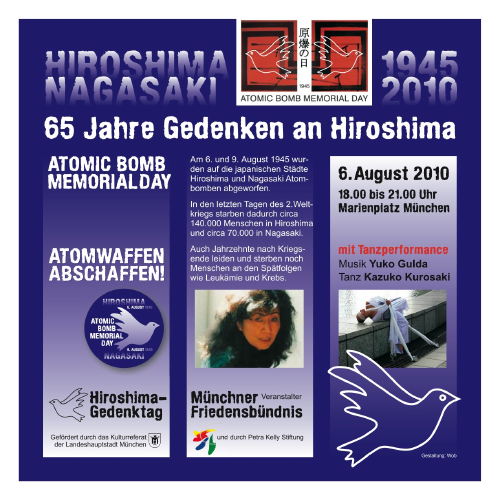 Zeit 6. August 2010 - 18:00 Ort Marienplatz Hiroshimatag 2010 - Freitag 6.8. Marienplatz Bilder ... Hiroshima-Gedenkfeier Das Flugblatt zur Information: Open-air-Veranstaltung Marienplatz (PDF 2.5M) Bilder vom Marienplatz Marienplatz - Freitag 6. August - 18:00 - 21:00 Uhr - Konzert und Tanzperformance Die japanische Pianistin und Komponistin Yuko Gulda spielt Eigenkompositionen; die japanische Tänzerin Kazuko Kurosaki zeigt ihre erschütternde Tanzperformance. Beide gestalten seit Jahren den Hiroshima-Gedenktag bei der UNO in Wien. Für die Medien: Die Künstlerinnen stehen gerne für Interviews zur Verfügung. (5.8. und 6.8.) Außerdem: Japanische Trommelgruppe (!), Peacezeichen mit Kerzen ... Veranstalter Münchner Friedensbündnis