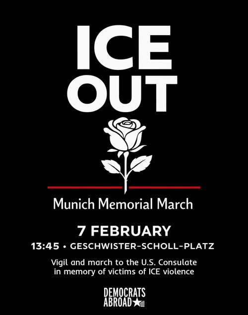 At 14:15, we will step off and march past the White Rose memorial — acknowledging Munich’s history of moral resistance — and continue to a rally across from the U.S. Consulate. At the consulate, we will hear additional speakers and raise our voices together through chants, calling for accountability, human dignity, and an end to state violence.