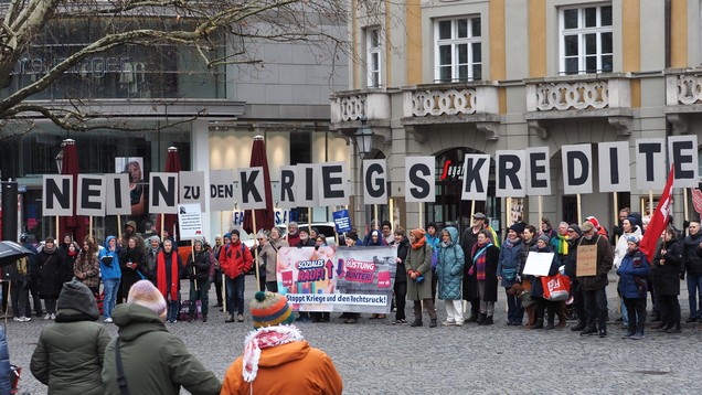 rufen wir, aktive Gewerkschafter*innen, zum öffentlichen Protest gegen  den geplanten nach oben offenen Aufrüstungswahnsinn auf, der am 18.  März per Grundgesetzänderung noch vom alten Bundestag abgesegnet  werden soll: die astronomische Summe von ca. einer Billion Euro*.