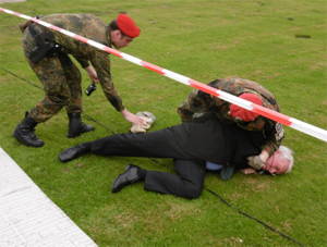 Unglaubliche Szenen spielten sich am Samstag vor Schloss Nymphenburg ab: Zwei Feldjäger stürzten sich unversehens mit voller Wucht auf einen Mann im schwarzen Anzug, der mit täuschend ähnlich wirkender Gauck-Maske vor dem Gesicht der angetretenen Truppe zugerufen hatte: „Habt acht!“ Keine drei Sekunden später rissen sie ihn von seinem mitgebrachten Schemel brutal zu Boden, sodass seine Brille zerbrach. Sie knieten sich auf ihn, rissen mit ihren rauen Quarzhandschuhen bewehrt seinen Kopf herum und fesselten ihn auf der Wiese liegend, um ihn dann ruppig abzuführen und abseits der Polizei zu übergeben.