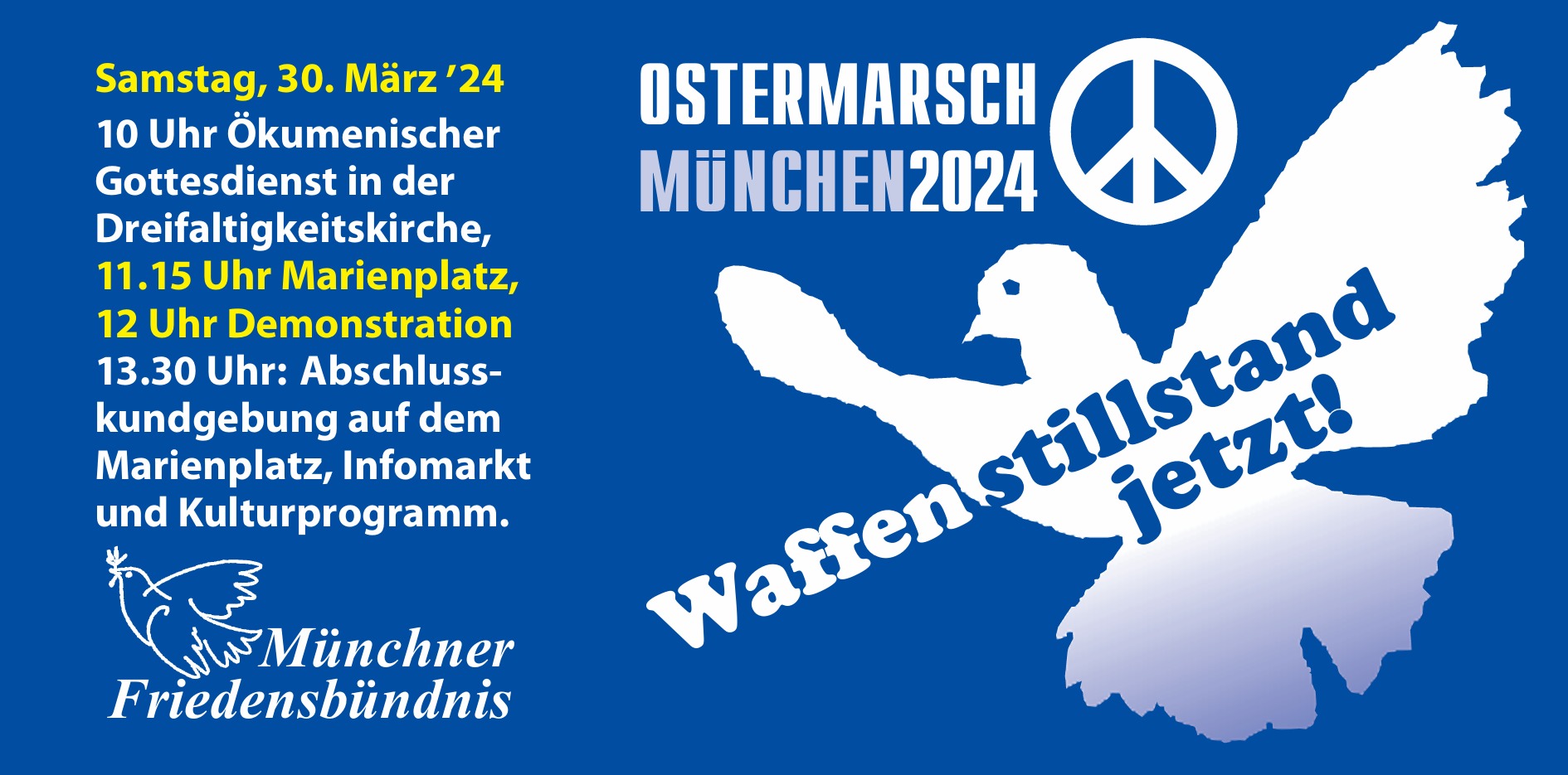 Anbei finden Sie, findest Du, unseren Aufruf zum Ostermarsch 2024, der überschrieben ist mit der Forderung: Waffenstillstand jetzt!