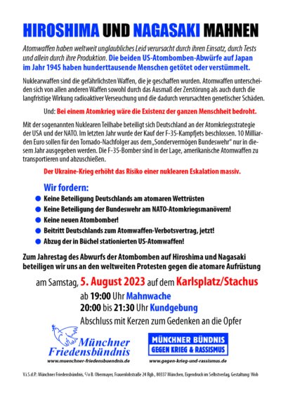 Die aktuelle regelmäßige Mahnwache für die Freilassung von Julian Assange in München findet am Sonntag, 6.8.2023 um 14 bis 17 Uhr am Max Joseph Platz statt - auch dort zu lesen https://freeassange.eu/#veranstaltungen/vigil_muenchen