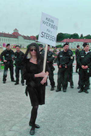 ... Wir protestieren gegen die Inbeschlagnahme öffentlichen Grundes für geschlossene Privatveranstaltungen der Bundeswehr zu militaristischer Propaganda und letztlich als Reklame für den Krieg, in den sie die frisch gebackenen Leutnants aller Voraussicht nach demnächst schicken wird.