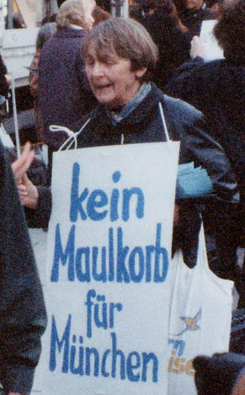 Renate Müller hat sich jahrzehntelang uneingeschränkt für das Friedensbündnis eingesetzt, mit viel Energie und ohne sich zu schonen. Auch der Beginn des heutigen Friedensbüros in der Isabellastraße geht auf sie zurück. Sie war sowohl für die "Friedensinitiative Christen in der Region München" als auch für die "Vereinigung der Verfolgten des Naziregimes/Bund der Antifaschistinnen VVN/BdA" dabei.