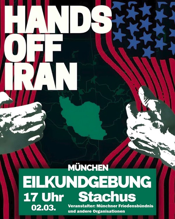 Eilkundgebung HANDS OFF IRAN 02.03. Zeit 2. März 2026 - 17:00 Achtung - doch keine weitere Demo vom Stachus! (unabhängig davon bleibt EineWeltHaus 18 Uhr Vernissage "Kriegssüchtig") Aufgrund des völkerrechtswidrigen Angriffskrieges auf den IRAN laden wir ein zur Ort Stachus München Veranstalter Münchner Friedensbündnis + SDAJ, Linksjugend Solid, DKP u.a.