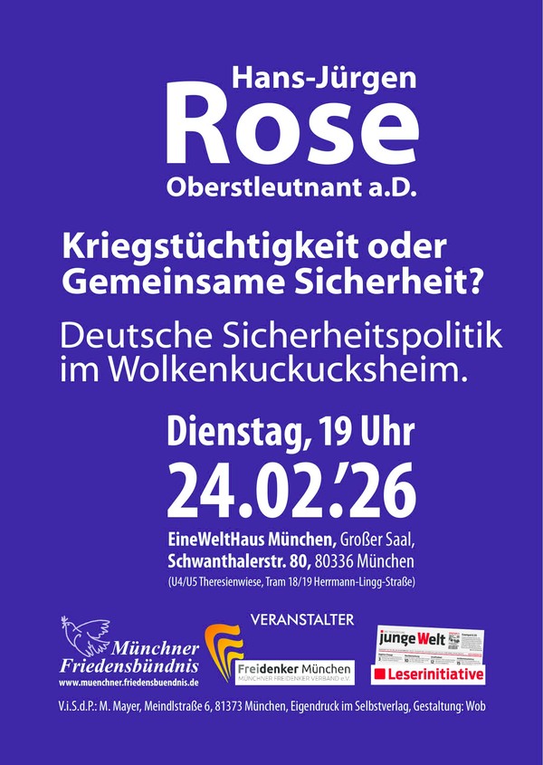 Hans-Jürgen Rose: Kriegstüchtigkeit oder Gemeinsame Sicherheit? Zeit 24. Februar 2026 - 19:00 Hans-Jürgen Rose:Kriegstüchtigkeit oder Gemeinsame Sicherheit? Deutsche Sicherheitspolitik im Wolkenkuckucksheim Veranstalter junge Welt Leserinitiative München Münchner Friedensbündnis Freidenker München