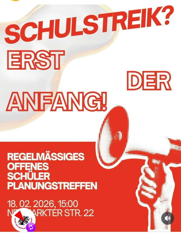 Schülerstreik - Nein zur Wehrpflicht Zeit 5. März 2026 - 11:00 Kundgebung Beginn 11 Uhr Orleonsplatz beim Ostbahnhof, dann Demo über Mariahilfplatz zum Marienplatz (mehr folgt) Ort Ostbahnhof Veranstalter Bündnis "Nein zur Wehrpflicht"