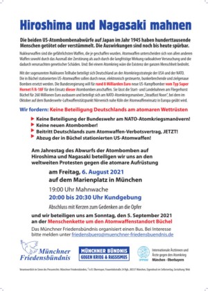 Das Münchner Friedensbündnis organisiert einen Bus. Bei Interesse bitte melden unter friedensbuero@muenchner-friedensbuendnis.de