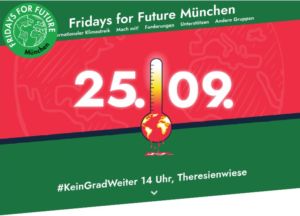 Vor einem Jahr demonstrierten 60.000 Menschen in München für sofortige, tiefgreifende Klimapolitik. Die Politik rast jedoch weiterhin ungebremst auf die Klimakatastophe zu und gefährdet damit das Leben aller auf dieser Erde. Daher muss unser Kampf für das Klima trotz Corona weitergehen! Deshalb rufen wir am 25.09.2020 wieder zum internationalen Klimastreik auf. Kommt um 14 Uhr auf die Theresienwiese!