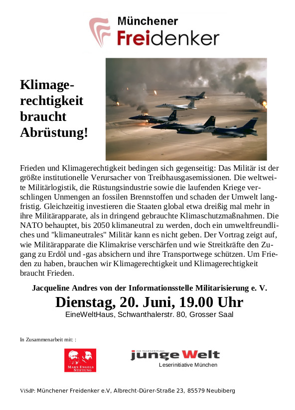 Frieden und Klimagerechtigkeit bedingen sich gegenseitig: Das Militär ist der größte institutionelle Verursacher von Treibhausgasemissionen. Die weltweite Militärlogistik, die Rüstungsindustrie sowie die laufenden Kriege verschlingen Unmengen an fossilen Brennstoffen und schaden der Umwelt langfristig. Gleichzeitig investieren die Staaten global etwa dreißig mal mehr in ihre Militärapparate, als in dringend gebrauchte Klimaschutzmaßnahmen. Die NATO behauptet, bis 2050 klimaneutral zu werden, doch ein umweltfreundliches und „klimaneutrales“ Militär kann es nicht geben. Der Vortrag zeigt auf, wie Militärapparate die Klimakrise verschärfen und wie Streitkräfte den Zugang zu Erdöl und -gas absichern und ihre Transportwege schützen. Um Frieden zu haben, brauchen wir Klimagerechtigkeit und Klimagerechtigkeit braucht Frieden.