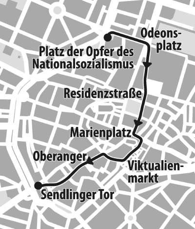 Der Demonstrationszug startet am neugestalteten "Platz der Opfer des Nationalsozialismus" (Auftakt) und führt zum Sendlinger-Tor-Platz (Abschlußkundgebung)